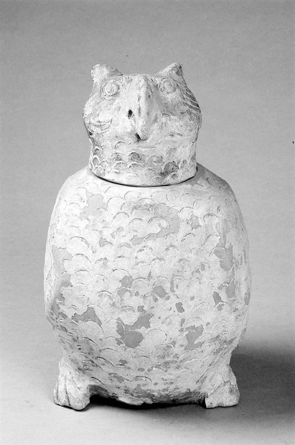 该陶尊高28厘米、胸径9厘米,泥质红陶、外施绿釉,正面看俨然一只栖立的猫头鹰,昂首直视,钩形鼻与上颚连接一体,双目炯炯,似有所瞩,大有伺机扑去攫取之势,两耳后倾,胸脯丰满,两腿竖立于翼下,除两翼及尾部饰简洁阴刻竖弦纹外,通体布满剔刺成鳞状排列的羽毛。