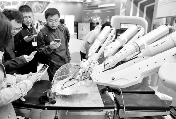 10月9日,观众在观看“双创周”北京会场主题展展出的一款腔镜手术机器人在做模拟组织缝合手术。