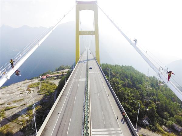国庆长假后,湖北鄂西高速养护部门抓紧晴好天气对四渡河特大桥的主钢索进行清洗维护。四渡河特大桥地处湖北宜昌与恩施交界处,横跨高山深谷,塔顶至峡谷谷底高差达650米,桥面距谷底560米,相当于200层楼高。新华社发