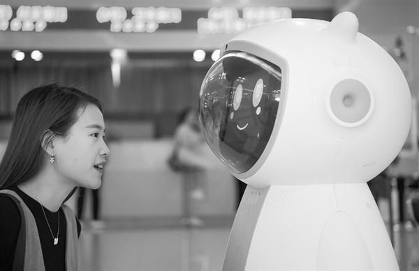 10月15日,市民在南昌市红谷滩新区行政服务中心大厅与智能机器人“小π”进行互动交流。