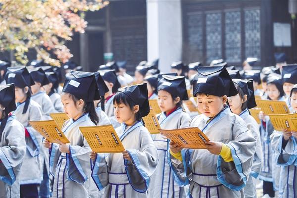 当日,浙江省长兴县第八小学举行“诵家规家训,传中华美德”校园“诚敬日”主题教育活动,通过诵读国学经典、讲励志故事、演美德戏剧等形式,让学生感受优秀传统文化。