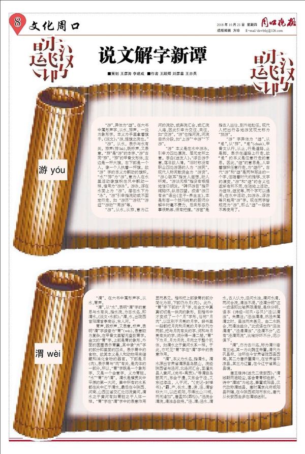 “游”,异体为“遊”。在六书中属形声字,从水,斿声。一说为象形字,本义为手里拿着旗子。《说文》:“游,旌旗之流也。”