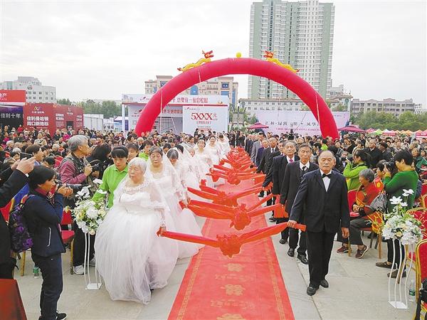 10月19日上午,在周口宏德养老孝道文化节上,18对老人身着盛装参加老年集体婚礼。典礼开始后,老人们手牵红丝带走上舞台,进行完现代婚礼仪式流程后,老人们互赠礼物,他们非常激动,有的相互拥抱,有的还流下了眼泪。台下的子女们也激动万分,纷纷走上舞台与自己的父母拥抱在一起。