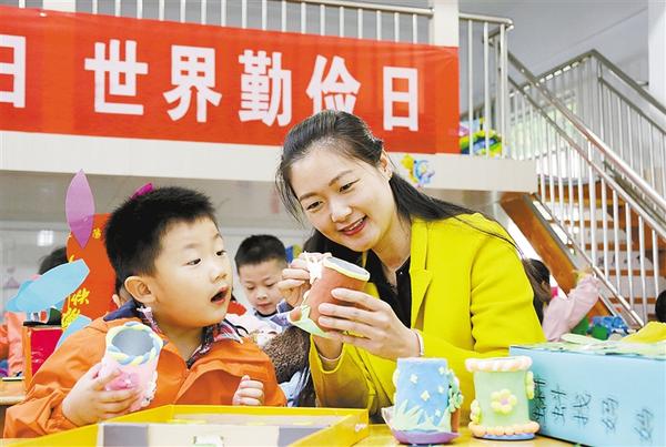 10月30日,山东省枣庄市建设路小学幼儿园的温浩铭小朋友和妈妈利用废旧物品制作手工艺品。