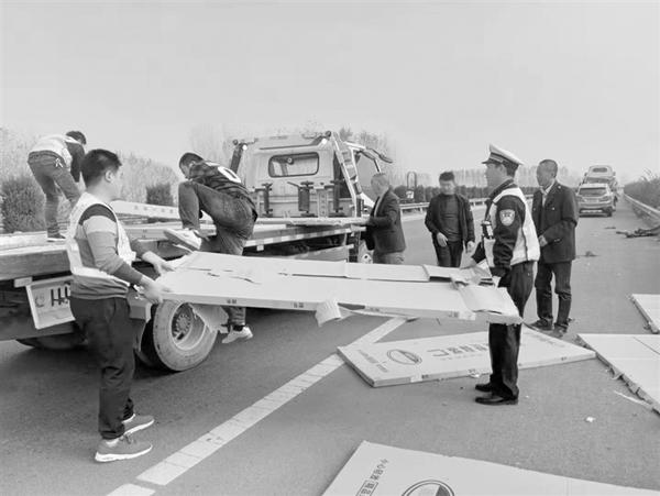 本报讯 11月4日12时许,一辆满载门板的小货车行驶至机西高速周口方向约144公里处时,被一辆越野车追尾,导致车上的门板散落一地,阻碍后方车辆通行。赶到现场的交警王凯伟等人与货车司机找来的救援人员,用了半个多小时才将散落的门板搬到救援车上,保障高速公路正常通行。