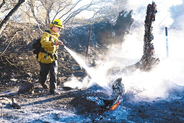 当地时间11月12日,在美国加利福尼亚州锡米瓦利,消防员在火场灭火。