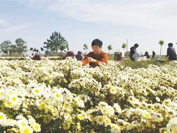 当日,在高集乡北部的党桥、双堂等行政村,贫困户正忙着把刚从地里采摘的菊花卖给富甲一方菊花加工厂。据了解,在富甲一方合作社的带动下,该乡北部的党桥、双堂等行政村今年有16户贫困户种植了80多亩菊花。乡政府对首次种植菊花的贫困户进行技术培训,并给予每亩1000元的生产奖补。麦茬种植菊花每亩可产菊花1100~1300公斤,菊花每公斤4元左右,除去人工费用,每亩可收入四五千元。