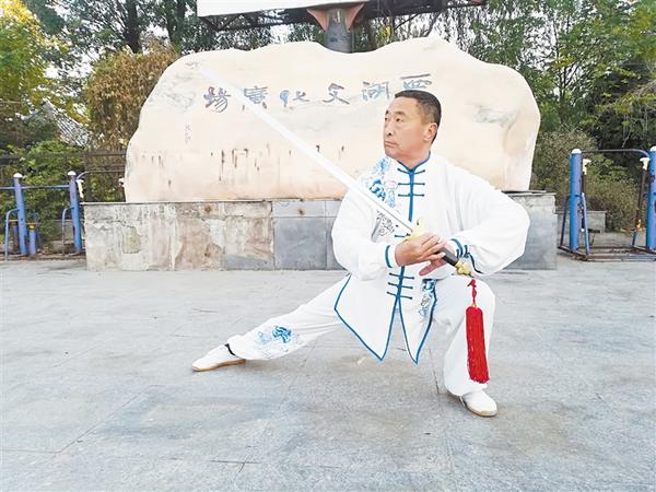 60岁的宋君华,淮阳县人,喜爱武术,2009年开始学习国标太极拳,2013年9月参加省“金融杯”42式太极拳获得金奖。 2017年3月,他开始在淮阳免费传授国标24式太极拳、42式太极拳和剑、32式太极剑等。图为宋君华在练习太极剑。通讯员 张然 摄