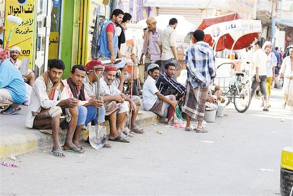 当地时间11月20日,在也门临时首都亚丁,当地务工人员坐在马路旁揽活。