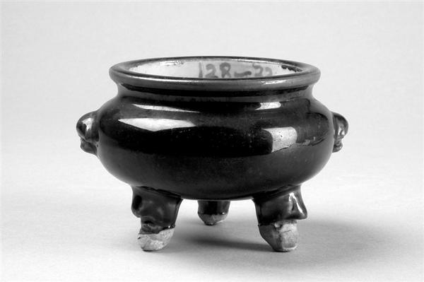 该炉高9.5厘米,口径11.3厘米,底径8.5厘米。宽唇沿,束颈,鼓腹,圜底。底部有三兽形足,腹附对称的熊首耳。通体黑釉,器内施白釉,沿部及底部施褐袖,灰白胎。