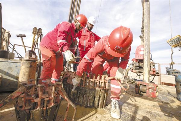 当地时间11月20日,在埃及明亚省,中国中曼石油公司的工人在钻井现场作业。