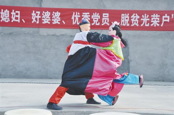 二鬼摔跤是一个人背驮着二鬼摔跤道具进行表演的民间舞蹈,又叫“夫妻打架”,主要流传于豫东民间,为县级“非遗”项目。表演所用道具包括两个互相对视的鬼头、两对搭肩假手、两个假腿和服饰。表演者通过腿、背、臂的活动及综合利用戏剧、杂技、武术的推、踢、翻、滚、旋等动作,达到两鬼打斗摔跤的喜剧效果。图为商水县民间艺人王保国在邓城镇“好媳妇、好婆婆”表彰会上表演二鬼摔跤,欢庆美好生活。