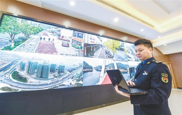 11月27日,城管执法队员在淳安智慧城管指挥中心监控街面各类可能出现的城市管理问题。