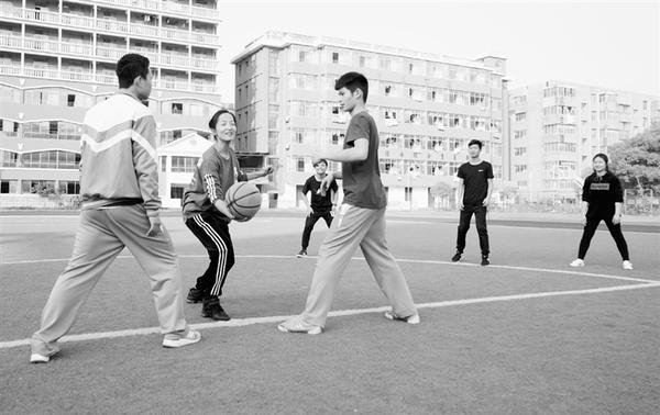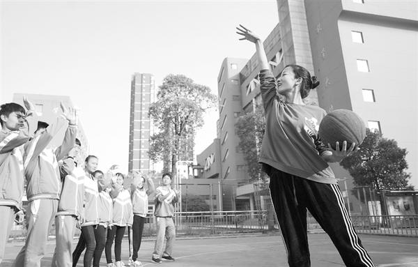 图1为11月26日,曾文萍(右)在学校给学生示范投篮;图2为11月26日,曾文萍(左二)在学校与学生一起玩“追球”游戏。新华社记者 胡晨欢 摄