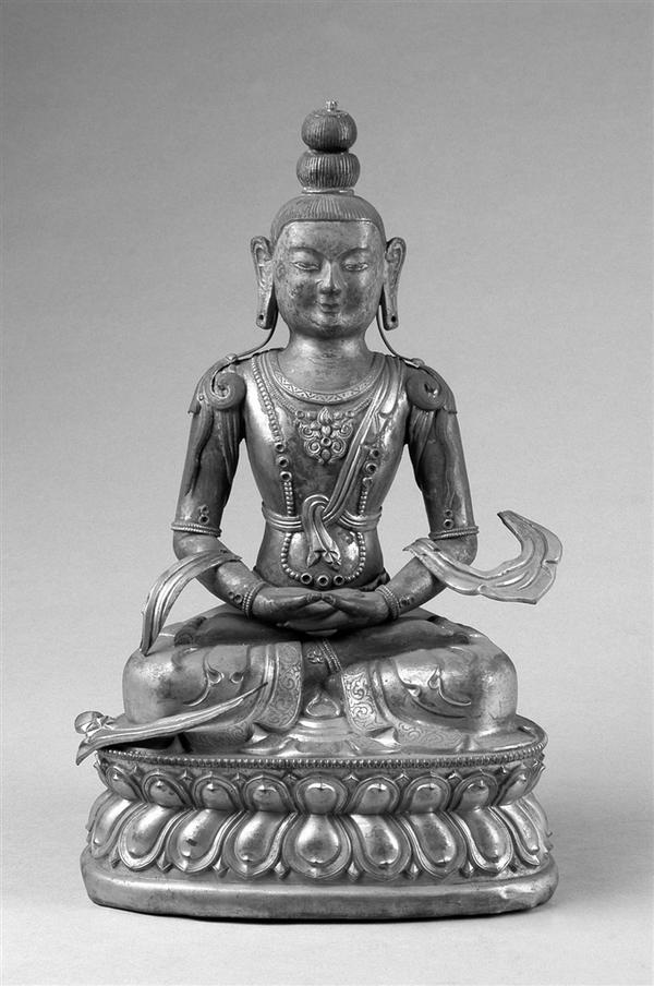 该佛像高38.5厘米,佛身高31厘米,禅定式坐在7.5厘米高的覆莲须弥座上。宝塔顶式发髻,蛾眉凤眼,二目微闭。隆鼻小口,口角微笑。两耳垂肩,硕乳细腰。神态清静神秘,颈戴珠宝莲花项链,一串佛珠自颈而胸垂至下腹部。臂戴手镯,有足镯一对,下身着勾莲花卉、宽边裙式裤,绸带如行云流水般从其肩、腰、臂间轻轻绕过,超然脱俗,飘飘欲仙。