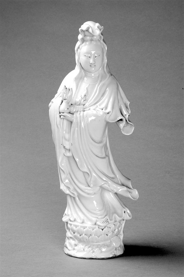 该观音面部沉静慈祥,形象生动,衣纹璎珞精细,釉色明亮、匀净,造型美观,有制造厂家,是民国时期民窑产品的代表作,具有较高的历史、艺术价值。