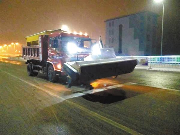 12月11日凌晨1时许,在周口市区大庆路桥上,严寒低温下,一辆融雪环卫作业车往返桥面抛撒融雪剂。据悉,为保障路面畅通和广大市民安全出行,川汇区爱卫办的工作人员加班加点,赶赴各自责任区域,连夜对中心城区主要路段进行消除积冰积雪工作。他们先后对中州大道桥等市区几座桥梁的上下坡道、桥面及文昌大道、七一路、交通大道、中州大道、八一大道、大庆路、建设大道等主要路段的背阴易结冰路面进行了抛撒融雪剂作业,防止路面结冰。记者 彭慧 摄