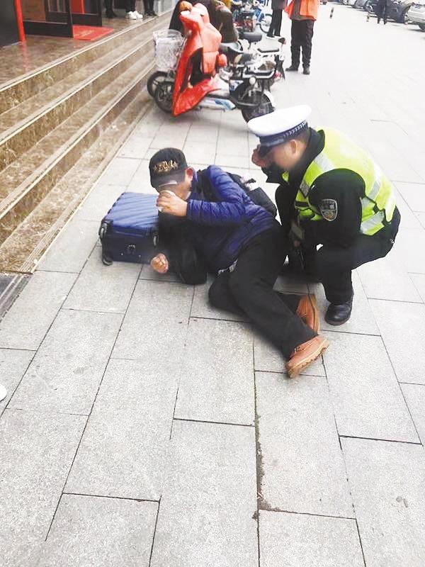 “老先生,您能听到我说话吗?醒醒。”何光辉蹲在老人身边,轻声在其耳边呼唤。老人能说话后,何光辉到附近商铺要来一杯热水让老人喝(如图)。喝完水,老人的精神状态有了好转,何光辉扶老人到路边休息。与此同时,毕鹏带领其他民警疏散围观群众,指挥过往车辆有序绕行,以免发生意外。10分钟后,120急救车赶到现场,医护人员对老人进行认真检查后,认为老人只是因过度劳累才晕倒,身体并无大碍。