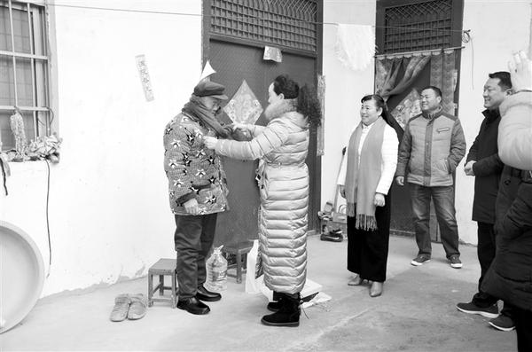 近日,薛华杰、王硕等市人大代表不顾寒冷来到太康县龙曲镇郑寨行政村慰问贫困户,为他们送去皮棉鞋、围脖等生活用品。今年以来,薛华杰、王硕等代表自发组织慰问团到太康县14个乡镇看望贫困户。图为代表们在贫困户家中慰问。