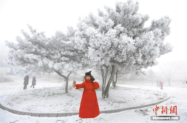 12月12日,吉林省吉林市松花江边的阿什哈达雾凇观赏带迎来了等级为“五颗星”的雾凇景观,吸引游客前来参观留念。