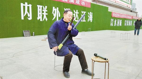 啄木鸟志愿者、“渔鼓道情”老艺人郭同学演唱的《中华梦圆齐欢唱》吸引了不少市民围观。只见郭同学端坐在舞台中央,手拿竹筒和竹板,边拍打边说唱(如图)。“这古老的艺术,如今真是不多见了!”一位市民说。