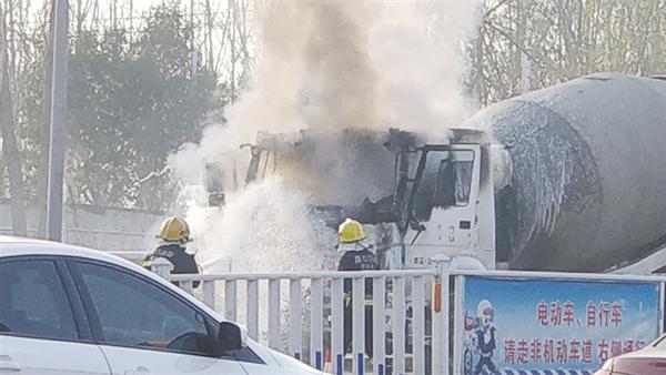 本报讯 12月17日8时许,周口中心城区大庆路桥头一辆混凝土搅拌车突然冒烟起火,路过的市民和消防员接力扑救,最终把火扑灭,驾驶员并无大碍。