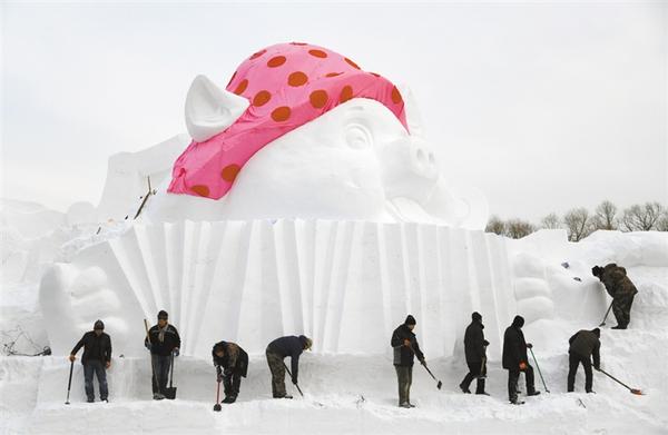 雪雕师在制作“欢乐金猪”主题雪雕(12月12日摄)。 日前,“欢乐金猪”主题雪雕在哈尔滨太阳岛雪博会园区亮相。这个为迎接农历猪年到来制作的雪雕由三只“翩翩起舞”的小猪组成,高12米、长22米。 新华社记者 王建威 摄