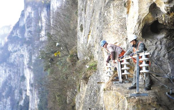 湖北省恩施土家族苗族自治州恩施市屯堡乡田凤坪村位于朝东岩绝壁下方,这个村子是恩施市深度贫困村之一。每年10月到次年3月,当地降水减少,这个村就会面临缺水问题,近800名村民要四处找水喝。今年10月份,驻村扶贫工作队和村民组成探水队,在朝东岩绝壁中间——距岩底300多米、岩顶100多米的天宝洞内,寻得一处水源。经过一个月的铺设管道、送发管线等工作,清泉从山洞引出到达田凤坪村。由于从深洞水源处到建蓄水池的地方管道长2700米,这些水管是一百米一百米地拼接起来的,距离长、接头多,水管拼接处会因缝隙漏气影响管道内的压力导致断流。经过研究,探水队决定在绝壁上安装设施、架设线路,利用水泵抽水下山。目前,架线和安装变电设施的工程正在进行中。新华社发