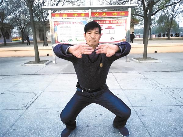 吕廷义,62岁,淮阳县人,出身武术世家,幼年就开始习练先天伏羲八卦拳,其内功可抗击6.5公斤铁锤的重打击。退休后,作为伏羲八卦拳第六代传承人,他着重培养徒弟,现有徒弟数千名。图为吕廷义在淮阳县老干部活动中心练习八卦拳。通讯员 张然 摄