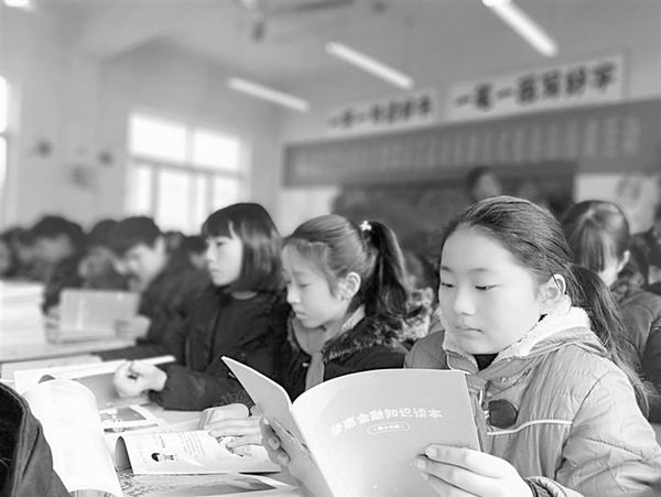 活动现场,中国人民银行商水县支行两名工作人员为该校学生讲解了人民币的有关知识,受到师生一致好评。图为新城小学的学生正在阅读宣传资料。