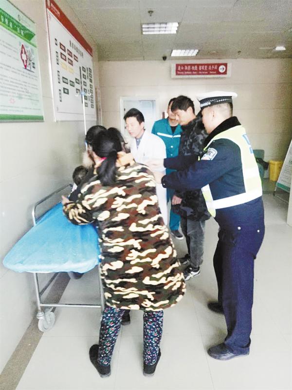 12月23日14时许,直属三大队交警毛浩霖,协警史磊、卢岩在七一路与龙源路交叉口附近执勤时,一位老大爷走到他们身边焦急地说:“警察同志,前面发生一起交通事故,一个孩子受伤了。”接到报警,史磊等人立即驾驶警车赶往事发地点。“在龙源路上,两辆电动三轮车发生碰撞,前方电动三轮车装着三角铁,后方电动三轮车上一个妇女抱着孩子,孩子满脸是血。”史磊说。