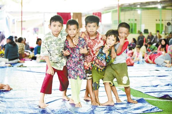 当地时间12月25日,几名男孩在印度尼西亚万丹省板底兰县的灾民安置点玩耍。