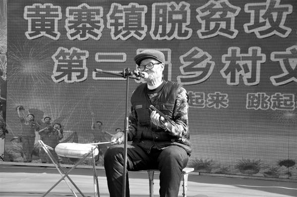 大鼓书是一种说唱兼有的传统曲艺艺术,演唱者一手敲鼓一手夹板,配合唱腔、道白,节奏和谐,唱一段说一段,还伴有动作表情。在上世纪六七十年代,大鼓书曾是豫东地区农民外出谋生的手段,随着温饱问题的解决,这门民间艺术正逐渐消失。近年来,在商水县文化部门的支持下,黄寨镇几位年过七旬的老人又敲起皮鼓、拿起夹板,颂唱起新时代的美好生活。图为该镇70多岁的老人赵国林在黄寨镇第二届乡村文艺汇演上表演大鼓书《九月花落树叶稀》。 记者 付永奇 摄
