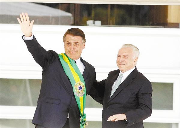 当地时间1月1日,在巴西首都巴西利亚的总统府“高原宫”,巴西总统雅伊尔·博索纳罗(左)与卸任总统特梅尔出席就职典礼。