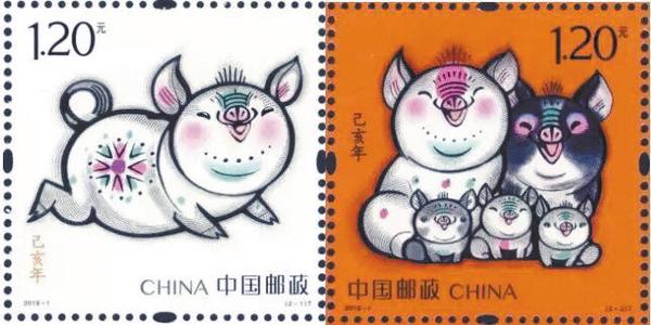 据了解,中国邮政发行《己亥年》特种邮票1套2枚,图案分别是“肥猪旺福”和“五福齐聚”,全套邮票面值2.40元。该套邮票邀请第一轮生肖猪的设计者、著名艺术家韩美林担纲设计,并延续了第四轮生肖票“合家欢”的设计理念。邮票第一图“肥猪旺福”,肥猪肚藏乾坤,憨态可掬,以奔跑的动态表现灵动生风的喜感,象征着正在奔向美好的生活。邮票第二图“五福齐聚”,是首次在一枚生肖邮票中完整体现“全家福”的概念,2头大猪和3头小猪同时出镜,其乐融融,寄托新春佳节合家团圆、五福临门的美好祝福。