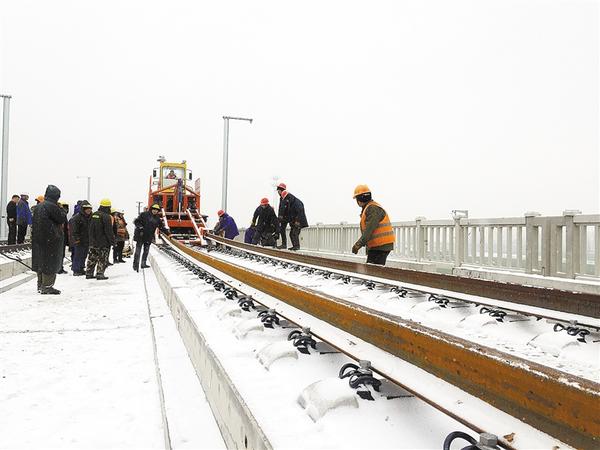 1月9日,漫天飞雪,寒气逼人,郑合高铁西华段建设现场却热火朝天。为确保工程进度如期推进,中铁一局的工人们正冒雪以每天至少5公里的速度进行铺轨作业。据了解,郑合高铁西华段全长33公里,铺轨工作预计5日内完成。记者 张猛 摄