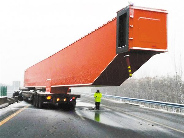 本报讯 1月9日下午,一辆载着长约33米、重29吨钢制航吊的大货车在大广高速发生单方事故后,市公安局交通管理支队高速二大队(以下简称“高速二大队”)民警和高速路政人员,用了6个小时才将事故车辆拖走,恢复正常通行。