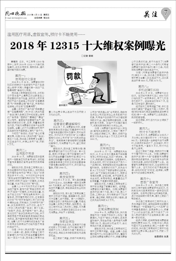 本报讯 近日,市工商局12315指挥中心发布2018年12315十大维权典型案例,涉及日用百货、居民服务、通讯器材等方面的消费。