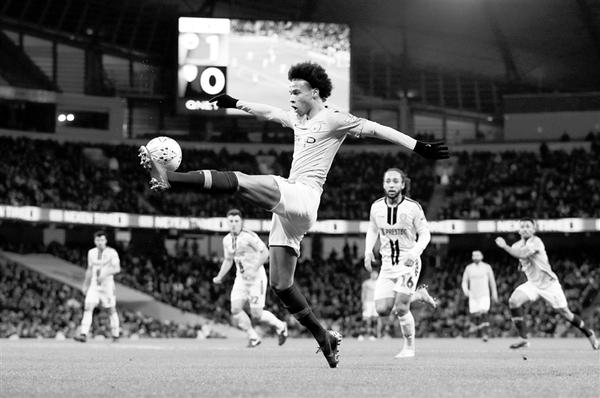 图为当日曼城队球员萨内(前)在比赛中控球。