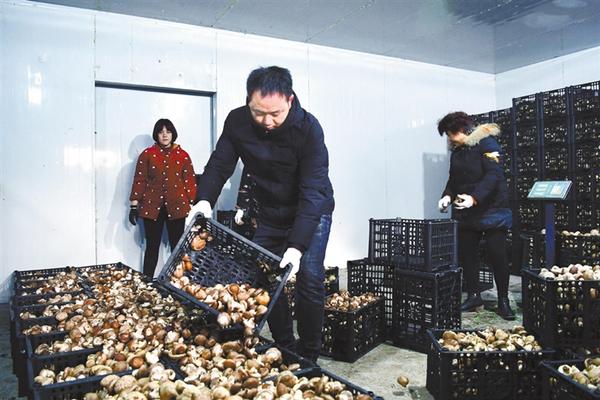 在河南省鲁山县瓦屋镇土桥村,村民们在冷库内整理香菇(1月13日摄)。