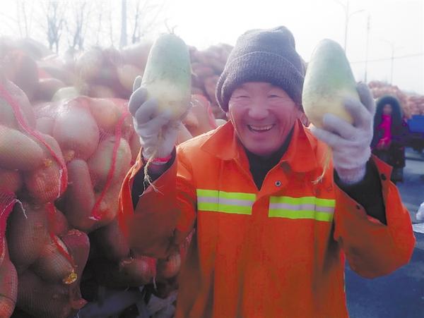 “来了,拉萝卜的车来了……”伴随着轰鸣声,满载“爱心萝卜”的15辆三轮车缓缓驶入辅路。个头硕大、水灵青翠的大萝卜装在红色的编织袋内,不少萝卜上还带着新鲜的泥土,外侧个别萝卜碰撞时留下的“伤口”向外散发着浓郁的味道。“这萝卜看着就非常新鲜,跟平常买的不一样,回去炖汤、熬肉,啧啧啧,那滋味别提了。”环卫工人刘师傅的话引发大家共鸣,整个活动现场气氛热烈而欢快。