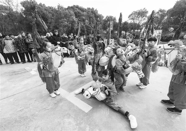 1月16日,孩子们为新塘村村民表演传统非遗项目——下箬马灯。下箬马灯是发源于长兴县的民间舞蹈,距今已有1000多年历史。