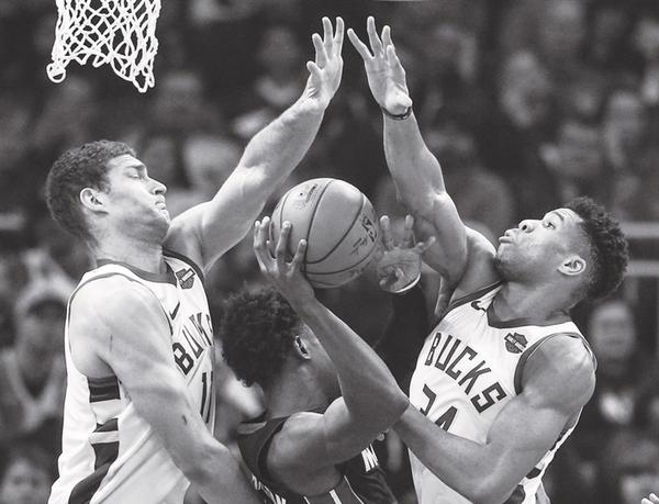 当地时间1月15日,雄鹿队球员洛佩兹(左)与队友安特托昆博在比赛中防守。
