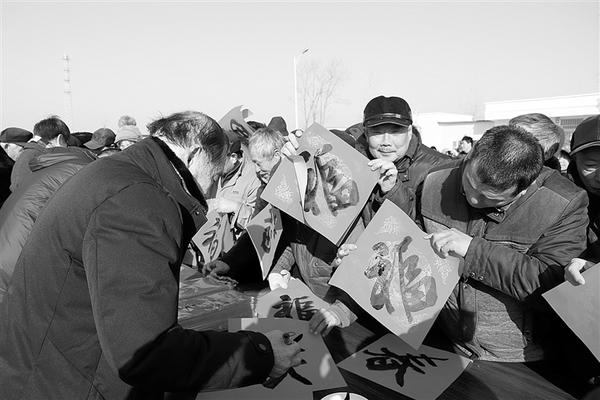 本报讯 1月17日,郸城县人大常委会、县文联组织县书法家协会的十多名书法家,到该县汲冢镇喻寨行政村开展义写春联活动。