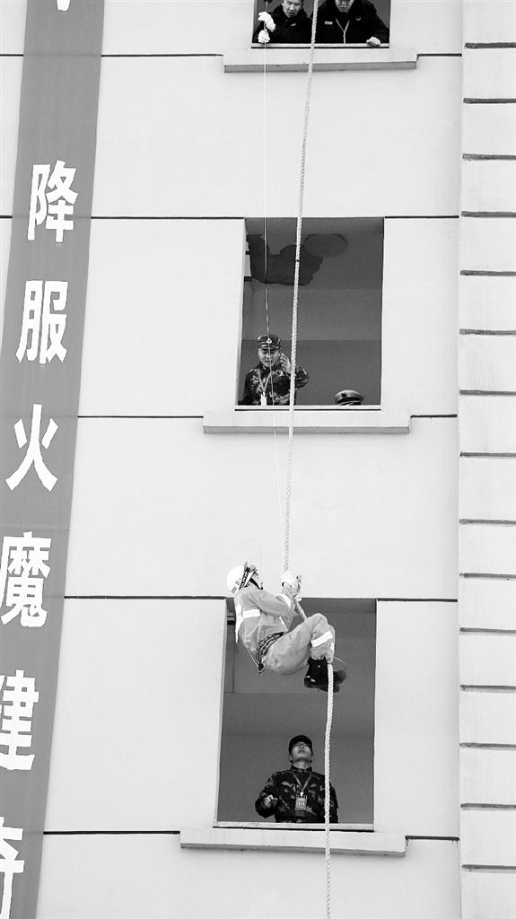 “沉着冷静别紧张,把平常训练时的水平正常发挥出来就可以。”川汇区消防大队的曹源宸即将参加比赛,跟随在他身边的同事不断给他加油打气。随着哨声响起,只见他两手抓牢绳索,右脚迅速卷起一段绳索固定借力向上攀爬,仅仅用时20秒就爬上了4楼,围观的同事不断喝彩。