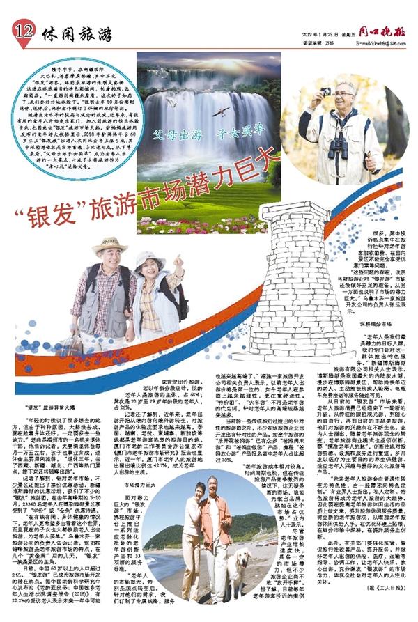 “老年人的市场很大,特别是观点转变后。针对他们的需求,我们订制了专属线路,服务也越来越高端了。”福建一家旅游开发公司相关负责人表示,以前老年人出游价格是第一位的,如今老年人在参团上越来越理性,更注重舒适性。“特价团”、“火车游”不再是老年游的代名词,针对老年人的高端线路越来越多。