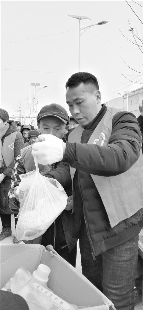 当日9时许,在太康县张集镇利民百货门口,几位爱心人士手起刀落,将一大块猪肉分割成若干小块,并分装进塑料袋。而其他爱心人士有的为现场的孤寡老人登记,有的整理爱心人士送来的物品,有的维持现场秩序。