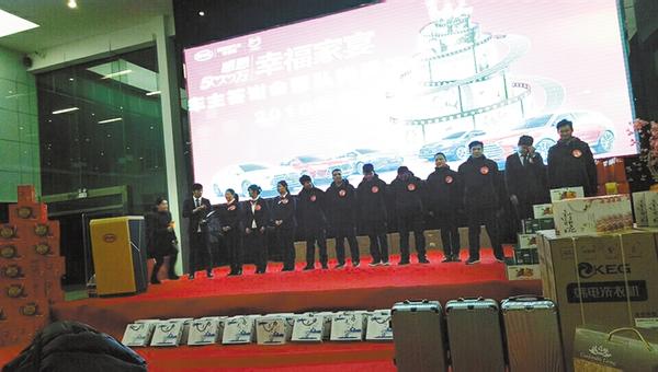 1月26日晚,周口弘祥比亚迪4S店举行“幸福家宴”新春年会,并表彰优秀员工。图为受表彰的优秀员工上台领奖。记者 杨运栋 戚团结 摄