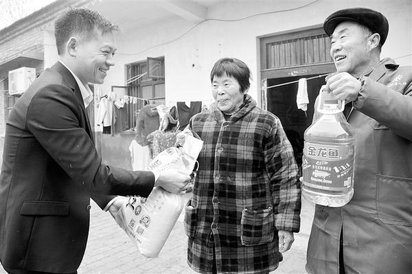 1月30日上午,商水县平店乡曾庄村在外创业党员曾小帅捐款10000余元,为该村20名60岁以上党员、30名80岁以上老人发放米、面、油等年货,并为平店乡敬老院送去200斤猪肉、10箱营养饮料,以表达他对父老乡亲的关爱。