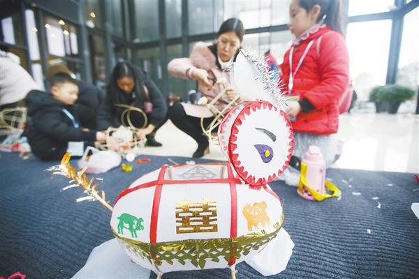 2月10日,在江苏南通中华慈善博物馆举行的“亲子做花灯 快乐迎元宵”活动现场,家长带着孩子一起制作花灯。